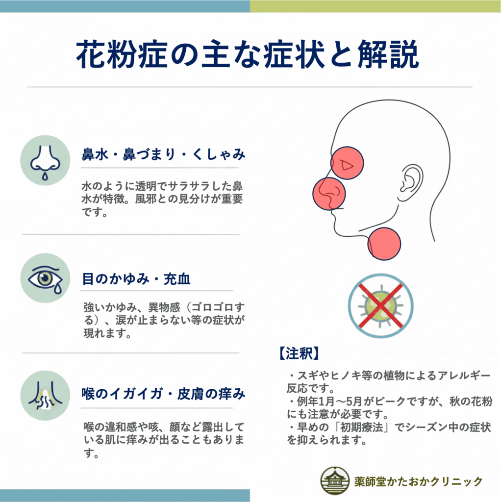 - 花粉症とは:スギなどの花粉によるアレルギー反応(季節性アレルギー性鼻炎)。