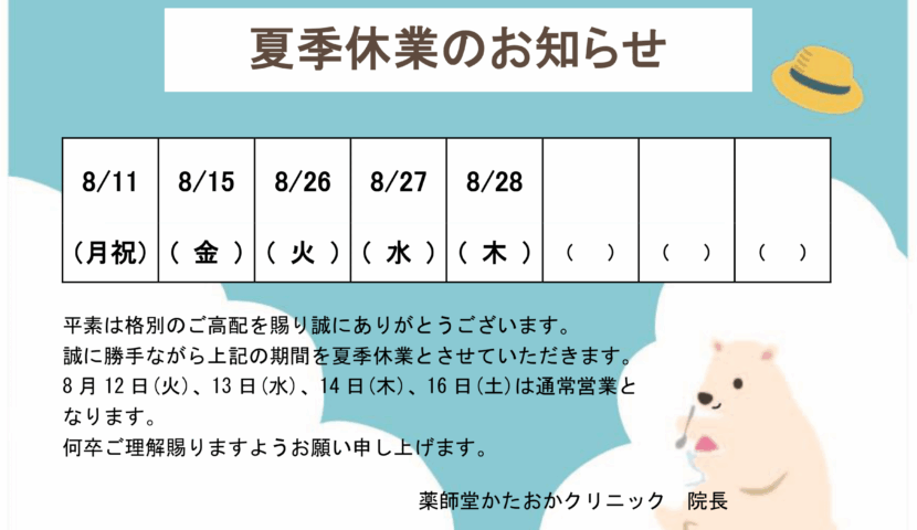 夏季休暇のお知らせ 2025.08.01 2025.10.08 お知らせ 当院は、8月15日(金)のお盆と、8月26日(火)から28日(木)を夏季休暇とさせていただきます。8月12日(火)から16日(土)までお休みのクリニックもありますので、お困りの際にはご相談ください。 6月10日開院しました前の記事 令和7年度 予防接種次の記事